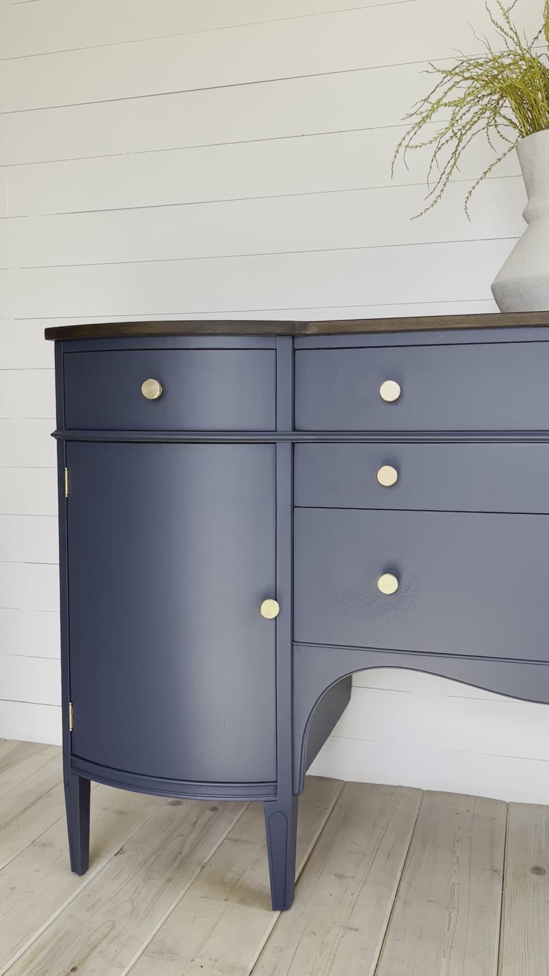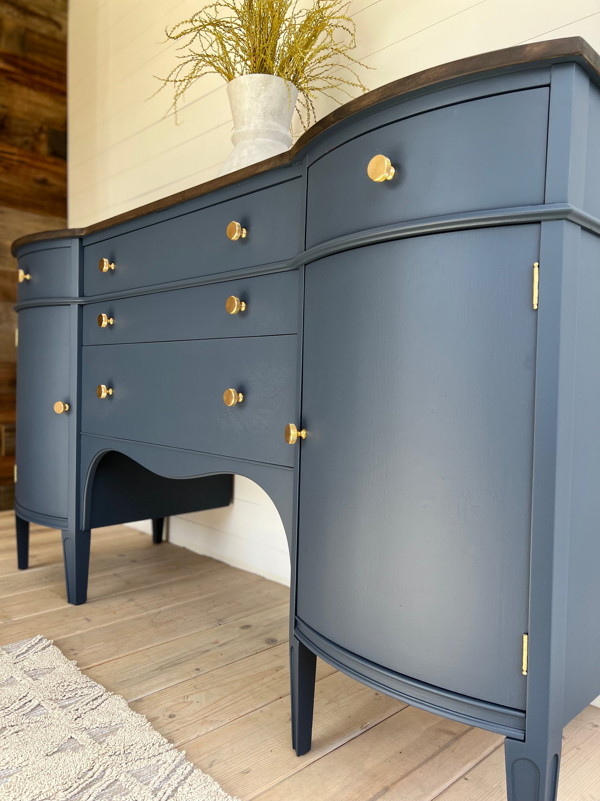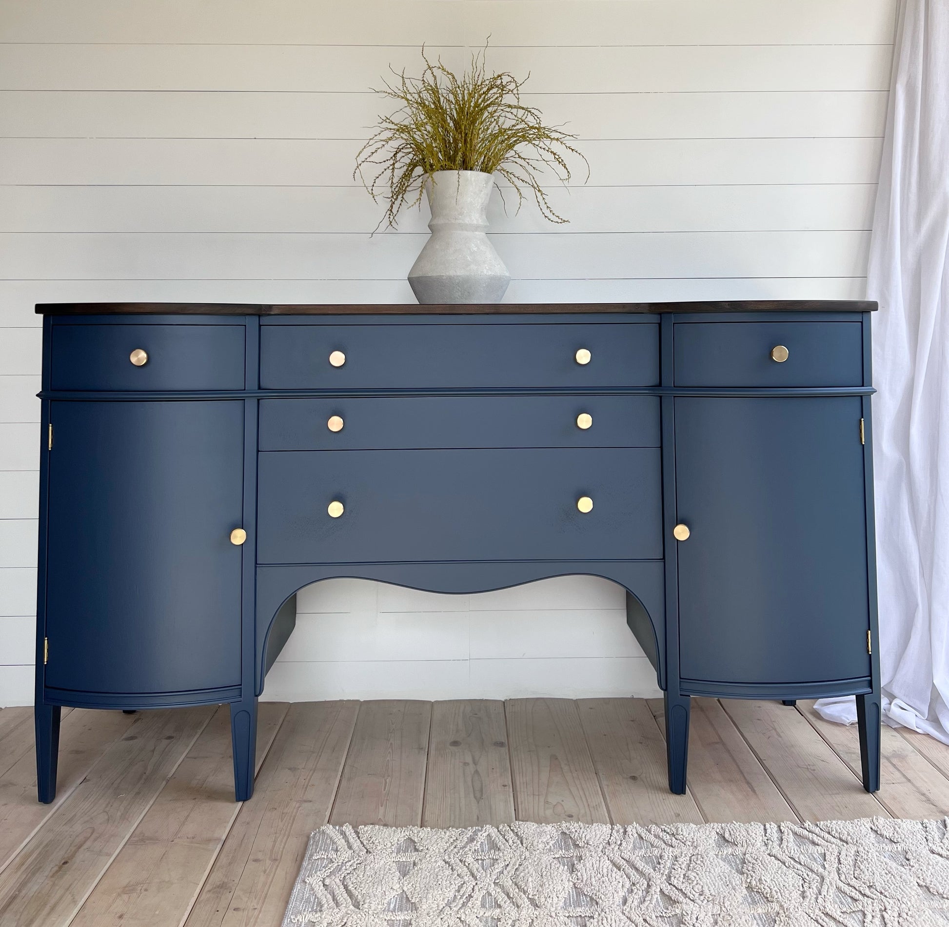This beautiful Vintage Buffet measures: 64” w x 22” d x 37 t” It has been painted in The color Inkwell, by Wise Owl Paint. It has been sealed in a water-based topcoat. All hardware knobs are new.