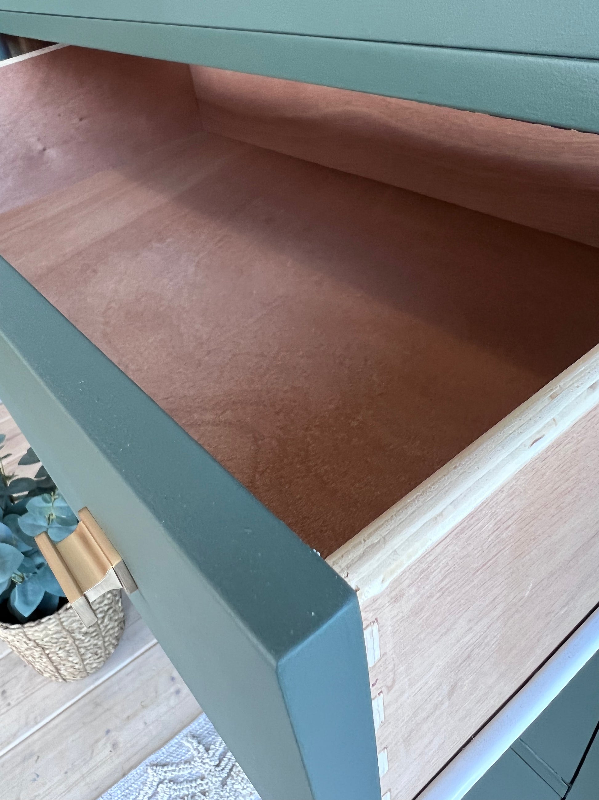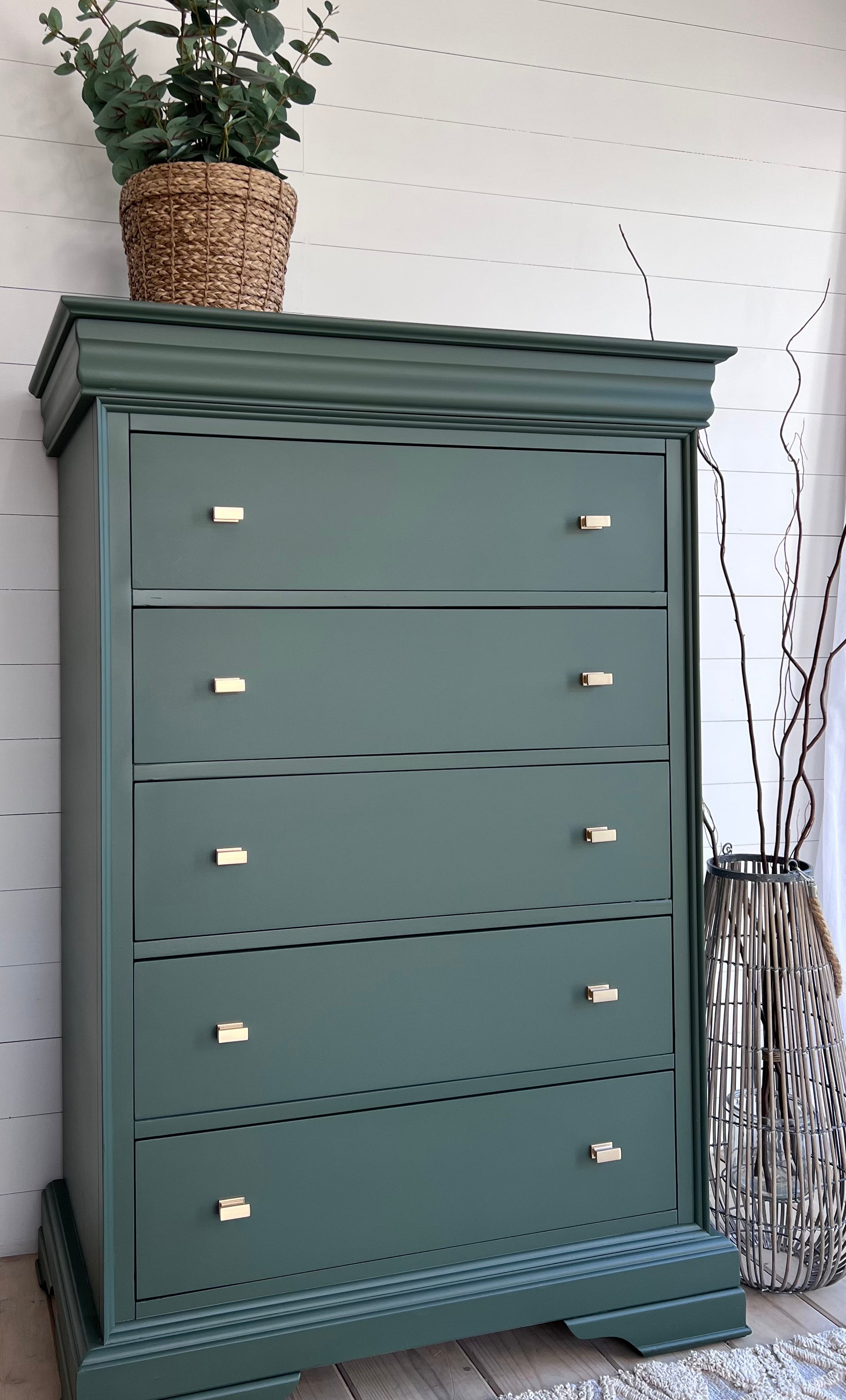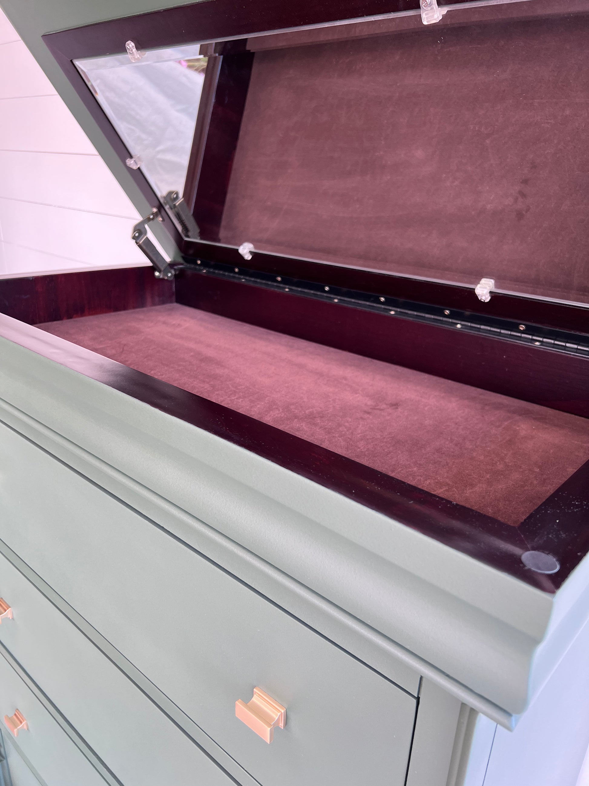 (NOT AVAILABLE FOR SHIPPING )This beautiful Dresser with Mirror measures: 36” W x 19” D x 52.50” T This chest of drawers & nightstand has been painted in Foxtrot, by Wise Owl Paint. It has been sealed in a water-based Varnish topcoat my Wise Owl. All new drawer brushed brass knobs.