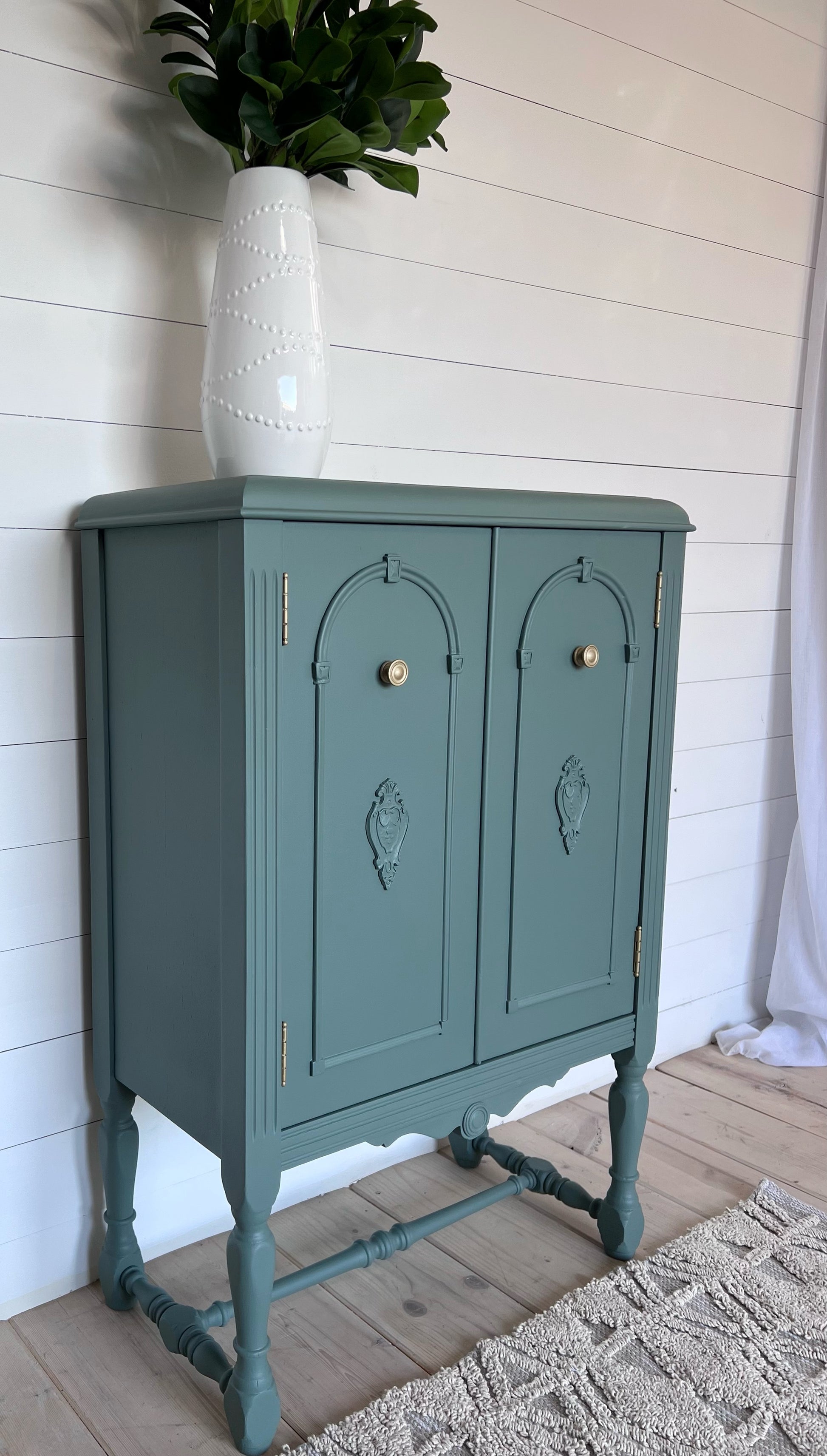This beautiful Vintage Raido Cabinet measures: 24.5” w x 13” d x 37.5 t” This vintage cabinet has been painted in Dried Thyme, by Wise Owl Paint. It has been sealed in a water-based topcoat. Cabinet knobs original and hand painted.